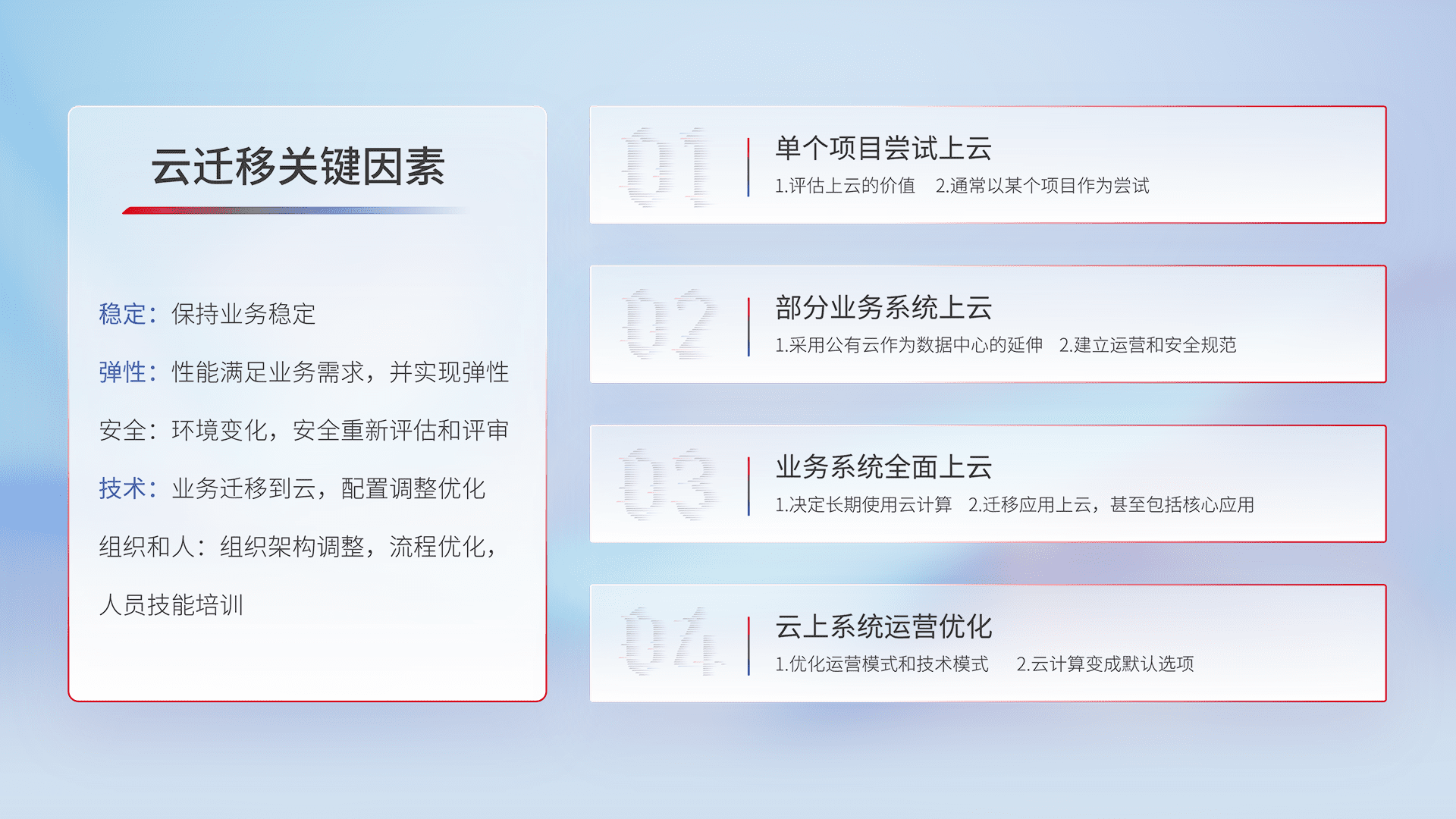 结合实际业务,,从规划设计、、、、云平台选型、、、云原生改造、、数据迁移、、、集成交付,,,迁移全过程为客户识别最佳上云路径,,做好风险识别管理,,,,设计网络架构、、、、身份权限、、、安全审计合规、、、、操作审计、、、、日志审计、、、监控告警策略、、、、多站点容灾设计等,,,对云上基础设施进行整体规划,,提升IT治理水平,,,以满足弹性、、高可用、、、、高性能的需求。。。